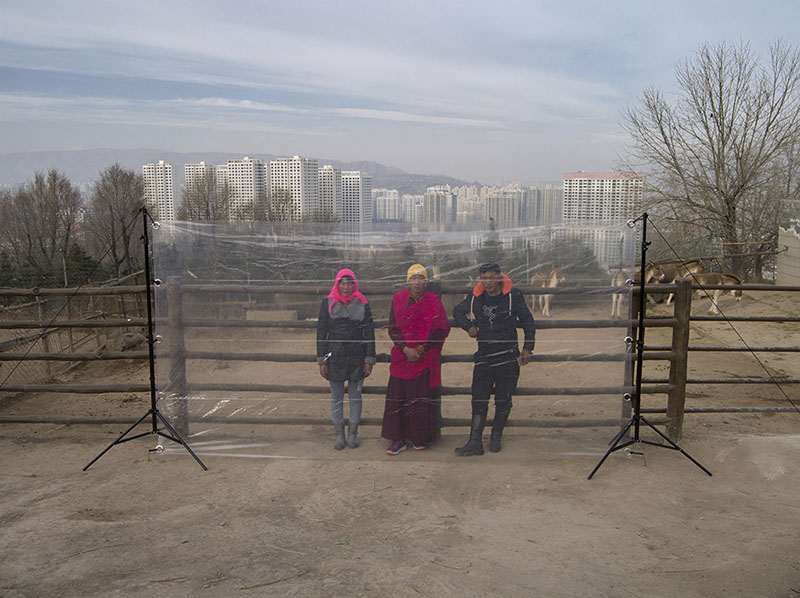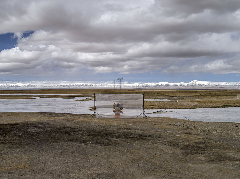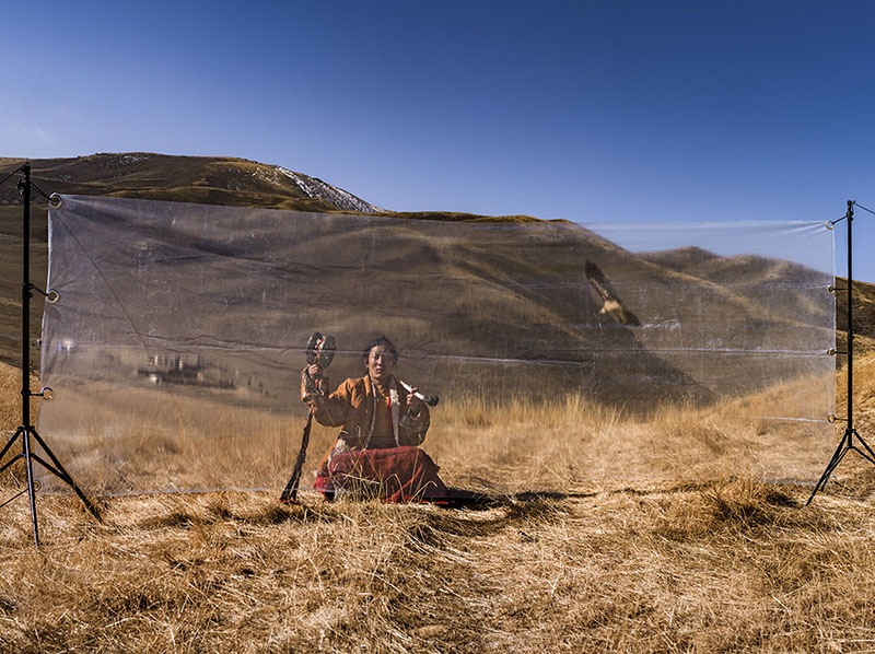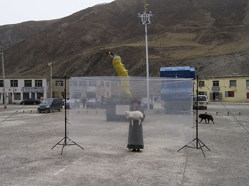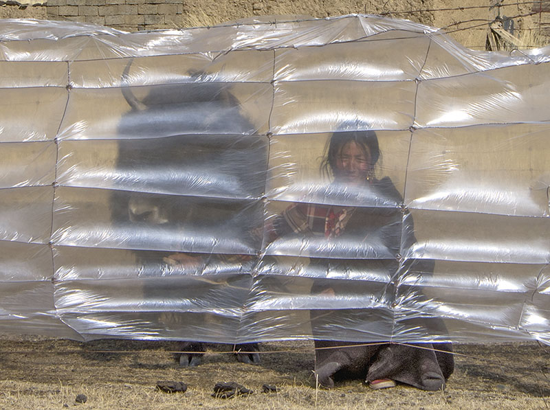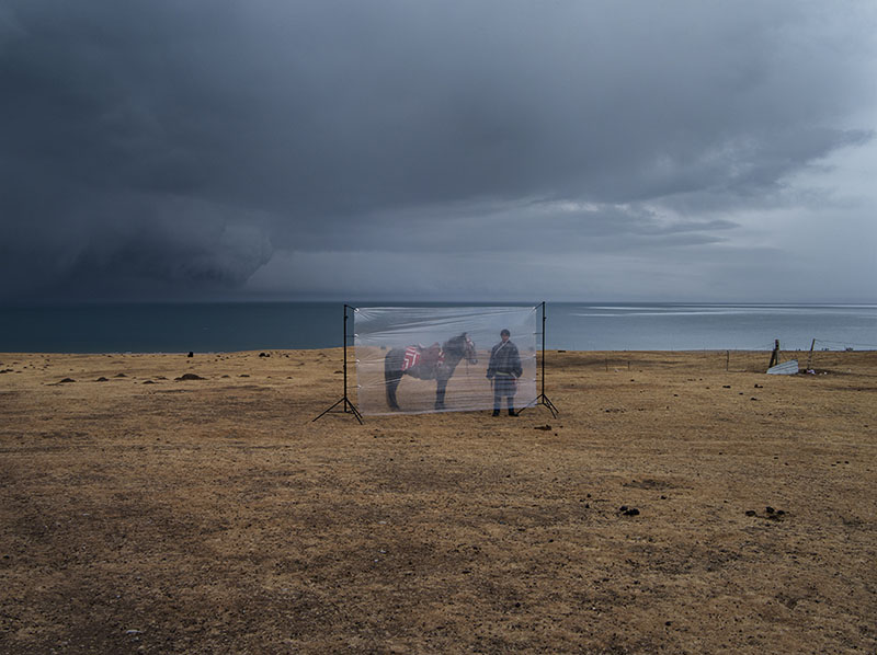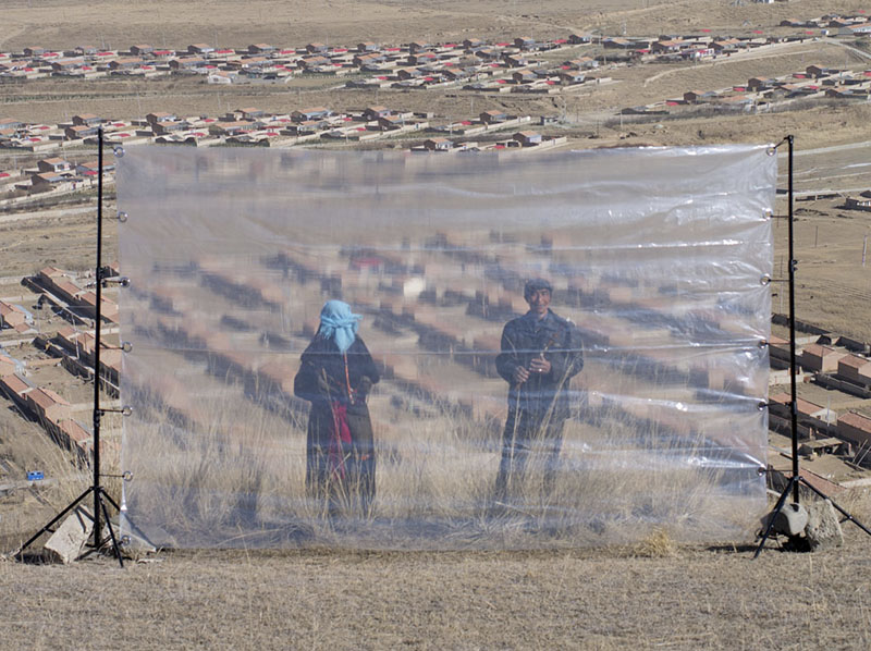 In 2009 I shot “Plastic Membrane”. From the winter of 2016 to the spring of 2017, I enlarged the plastic membrane that had been used as a prop in my photographic works, and embedded a device in the scene chosen by me. The photography objects and I were peering at each other with the membrane in the middle. I am naturally sensitive to a variety of realistic issues in the Tibetan areas. This time, taking photos mainly in the Tibetan areas on the Qinghai Plateau, I intend to express my thoughts and questions on this land through the half-transparent plastic membrane.